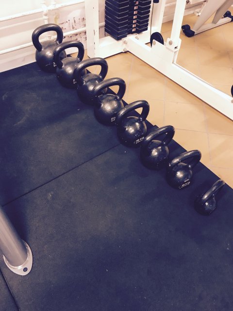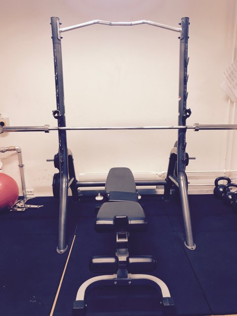 Kondicykel, løbebånd, cross-trainer, romaskine, stepmaskine, benpres-maskine, GHD-maskine, TRX, fritstående squat/bænkpress static, kettlebells fra 4 - 32 kg., håndvægte op til 50 kg., pull up-bar, 10 kg. vægtstang, smith-stativ, kabel-tårn, træk-tårn, stepbænk, plads til dødløft, legpress/curl-maskine, curl-rack og forskellige muligheder for coretræning.